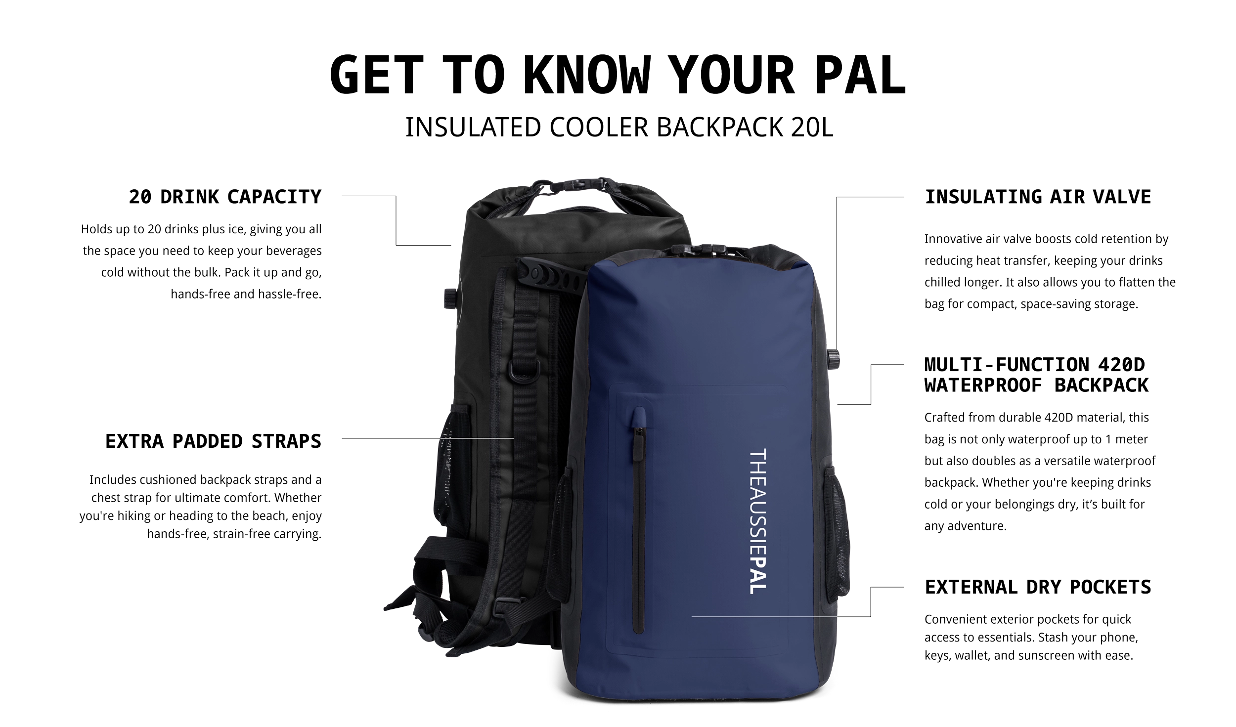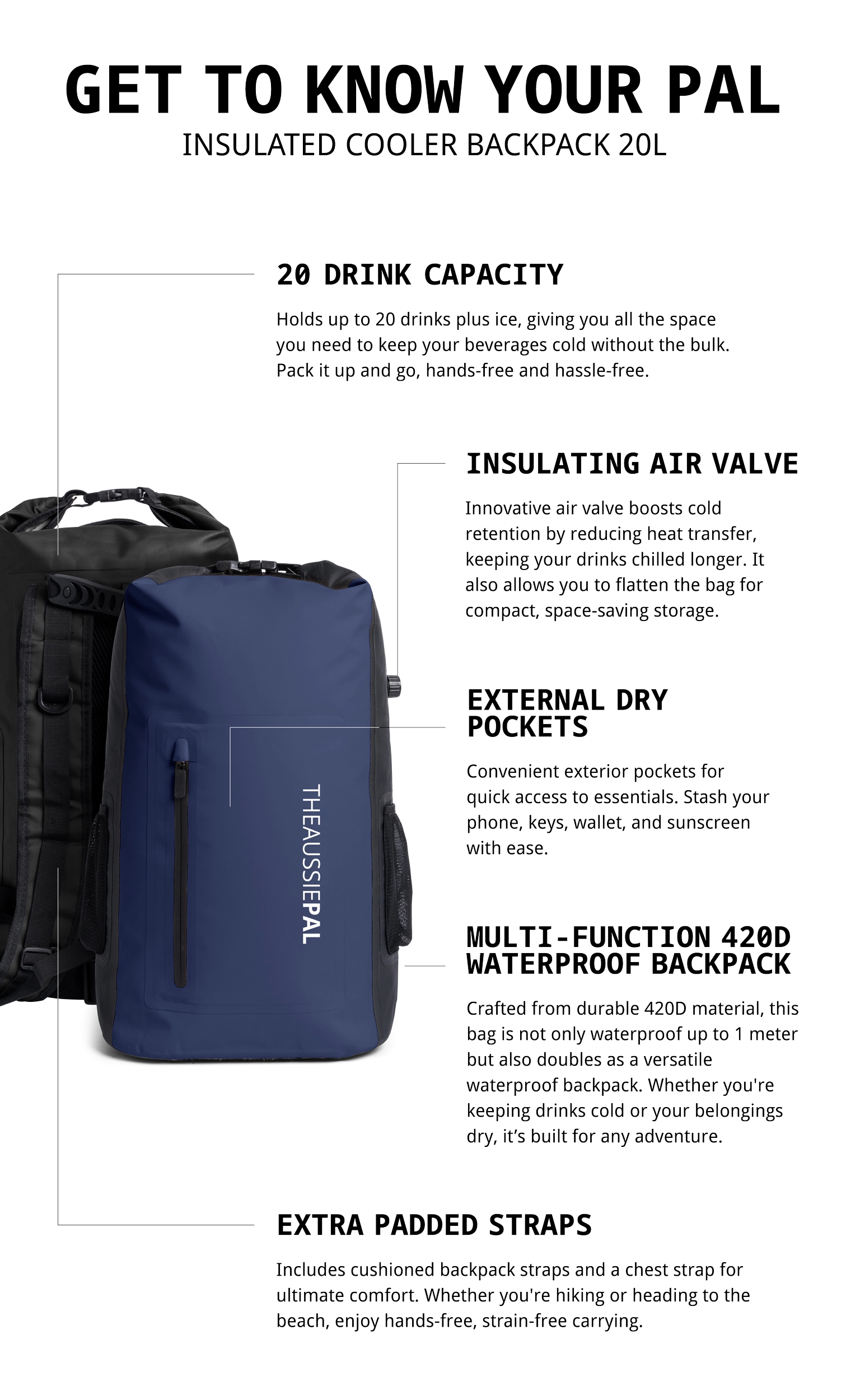 To make transportation effortless, the bag is equipped with padded backpack straps, waist strap and a chest strap that ensures comfortable, hands-free carrying. With its impressive features and convenience, our Insulated cooler back pack is undoubtedly the coolest way to keep your drinks at the perfect temperature.